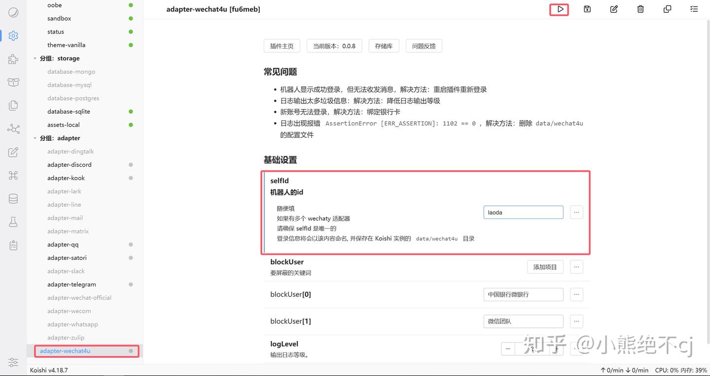 - 配置页如下,随便填一个 机器人id ,然后点击右上角启动插件