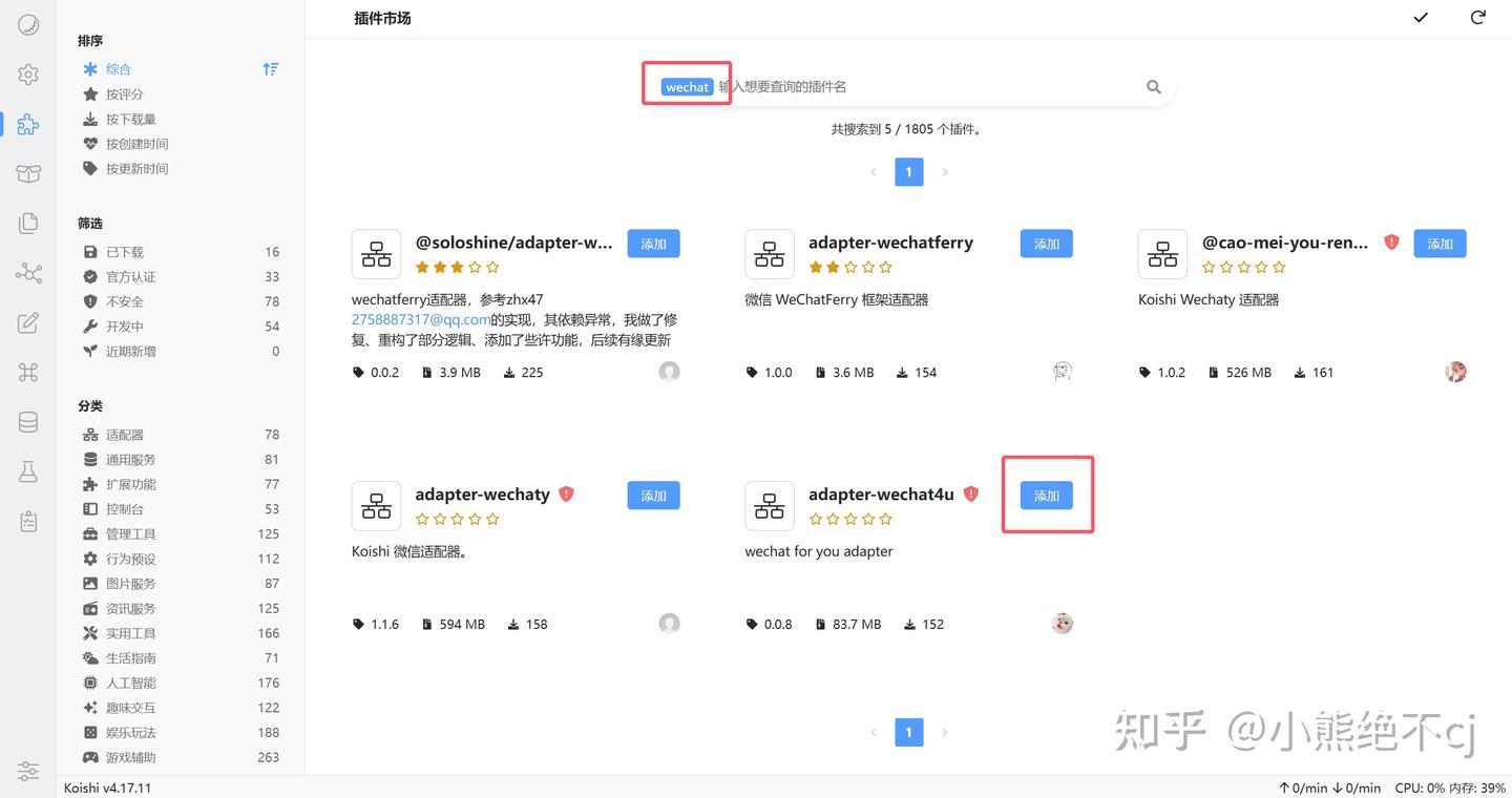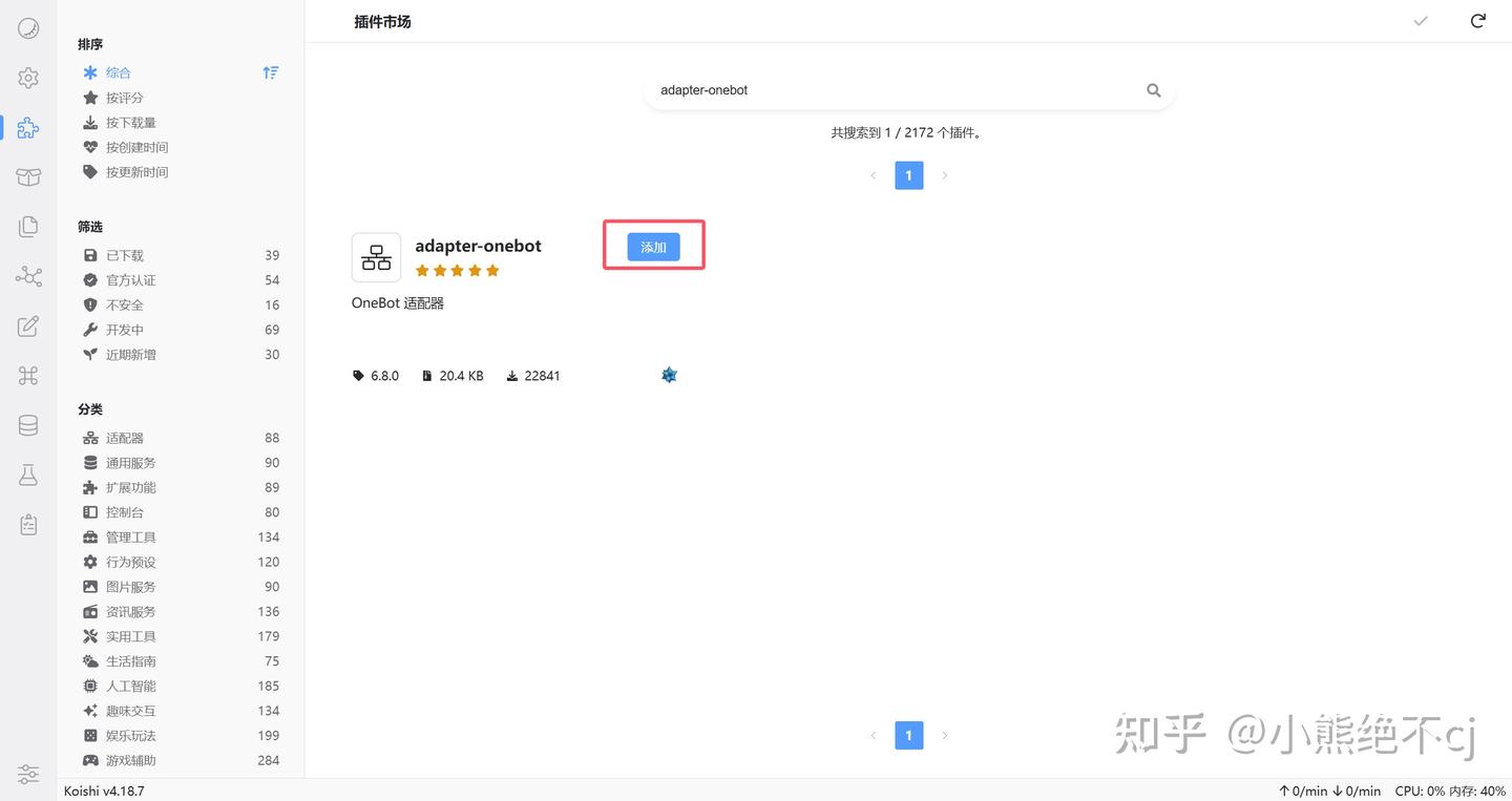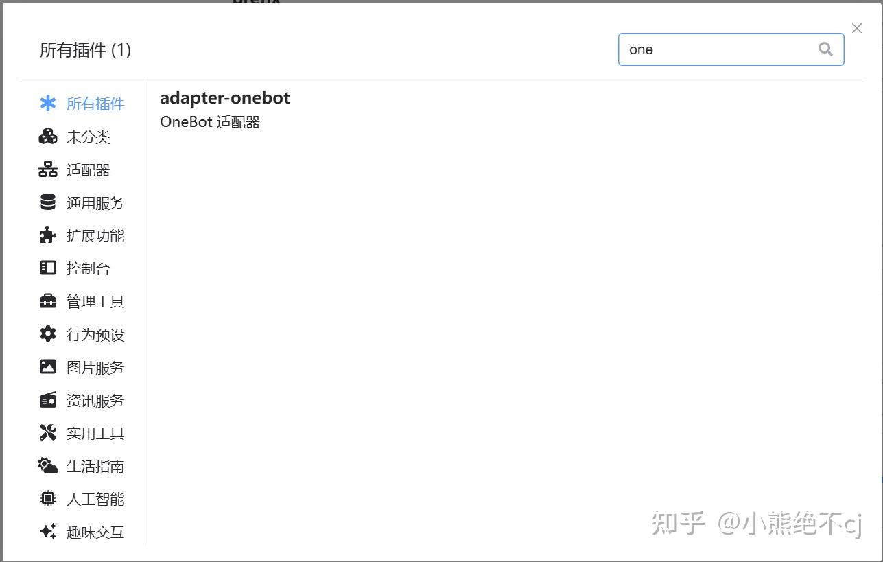 在插件市场中,搜索 adapter-onebot,点击添加,安装