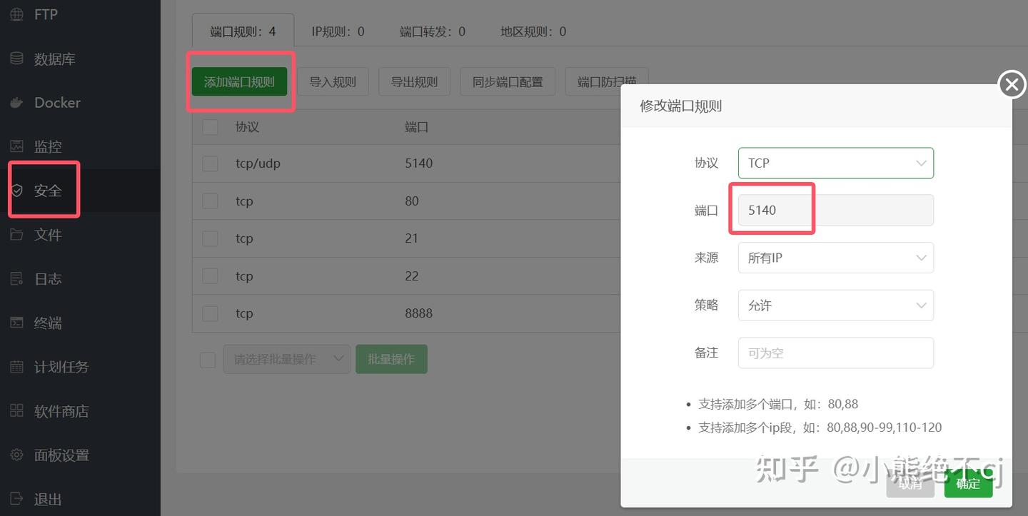 - 开放端口需要经过两个墙,第一个和前面开放8888端口一样,在华为云安全组规则配置就行了。第二个在宝塔安全面板设置,如下: