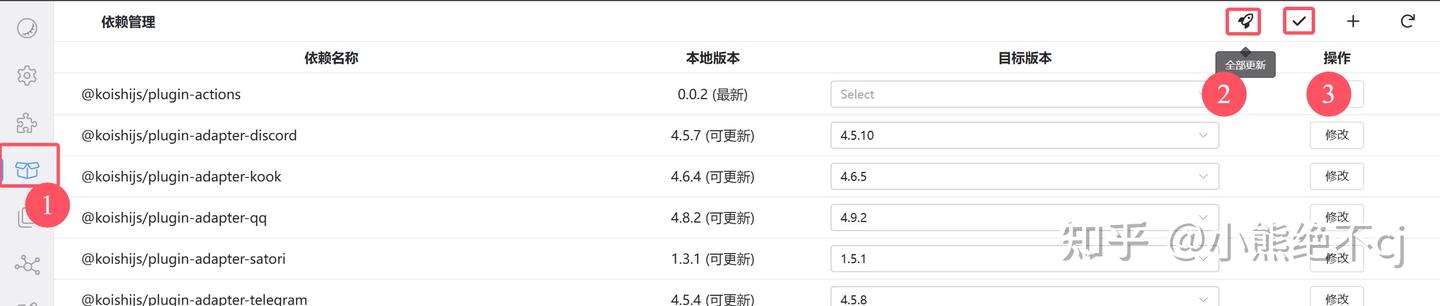 - 点击左侧栏 依赖管理① ,点击 全部更新② ,应用更改③