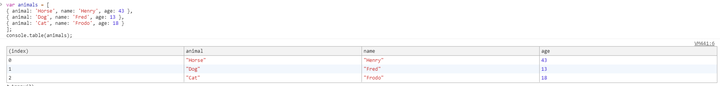 很多的时候,你可能会有一堆对象需要查看。可以用console.log把每一个对象都输出出来,也可以用console.table语句直接把所有的对象都直接输出成为一个表格